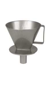 Een stevige koffiefilterhouder geschikt voor filterzakje no. 4. Deze houder kan gebruikt worden boven een mok, en door de tuit aan de onderkant is de deze ook geschikt voor gebruik op een thermosfles of koffiekan.