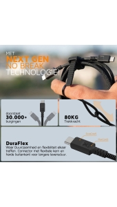 Xtorm Next Gen Cables zijn gemaakt van FlexCore materiaal aan de binnenkant en DuraCore aan de buitenkant. Deze TPU materialen, grotendeels van gerecycled plastic met GRS-certificaat, zijn niet alleen sterk maar ook flexibel. Het maakt niet uit hoe de kabel in je tas of koffer zit; de gevlochten kabel doorstaat met gemak meer dan 30.000 buigingen en breekt zelfs niet met een gewicht van 80 kg eraan. De ideale kabel om mee te nemen tijdens een kampeertrip of hike – #NextGenProof.
